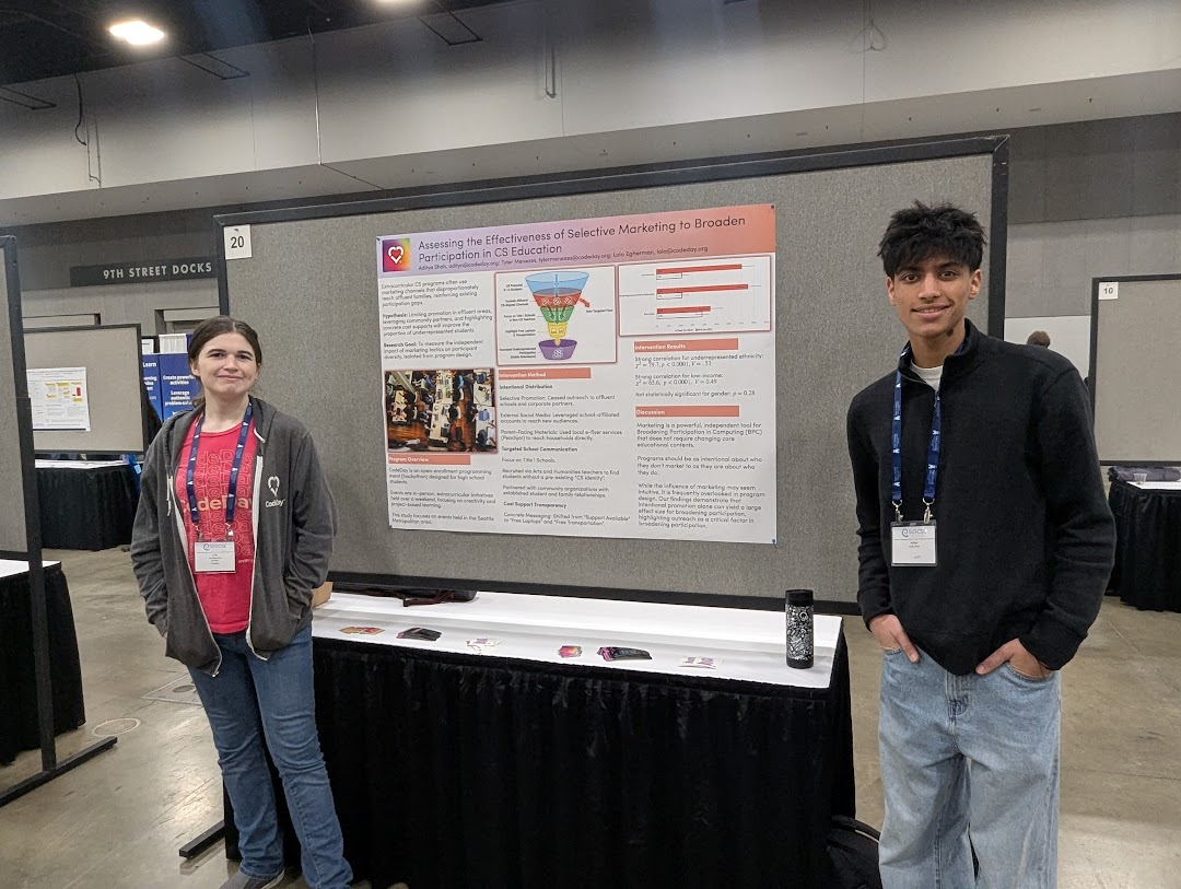 I was at SIGCSE to present research (read the paper here) my colleague Aditya (right) did on event outreach. This was my first time presenting a poster at a conference, which was kind of cool. Lots of people asked interesting questions and it was a good way to meet new people.